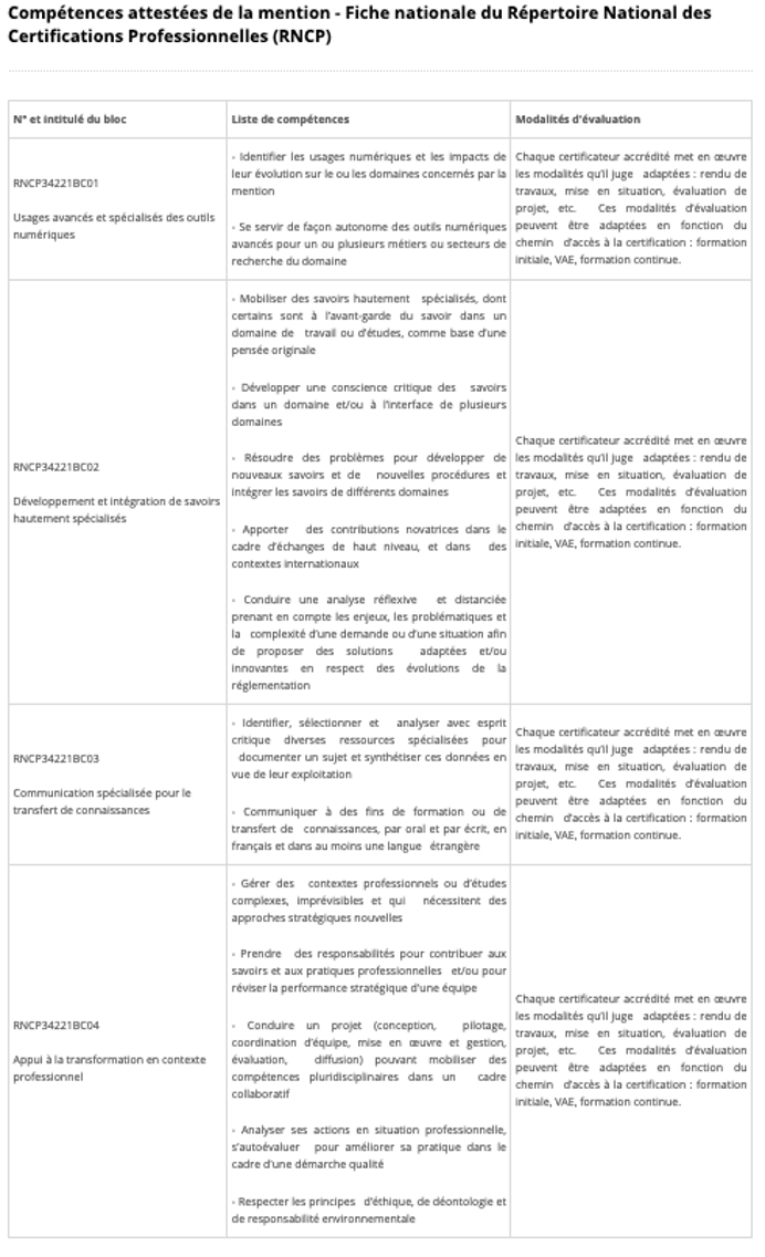 À noter que le parcours est ouvert à l'apprentissage avec un effectif limité (7 à 8 étudiants). Ceci permet à des étudiants disposant de peu de moyens financiers et de réseaux professionnels de mieux s'insérer dans la vie active tout en étant familiarisés avec les avancées de la recherche.