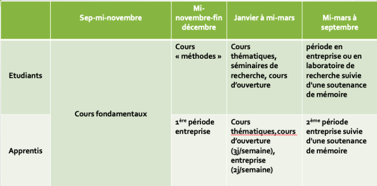 Si le parcours est ouvert en alternance, c'est seulement pour un (très) petit nombre d'étudiants (1 ou 2 étudiants) souhaitant s'insérer dans les directions "recherche" et études des grandes entreprises ou dans des laboratoires d'instituts de recherche afin de s'insérer dans ces structures dès le M2.